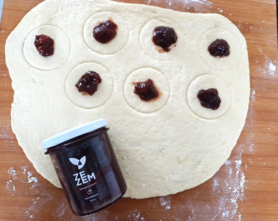 Po vykynutí těsto rozdělíme na dvě části a obě vyválíme, a to asi na výšku 1 cm. Dle potřeby si na vál přidáme hladkou mouku, aby se nám s těstem dobře pracovalo. Poté použijeme skleničku, velikost skleničky zvolte dle toho, jak velké chcete mít koblihy. Na jednu z placek si skleničkou naznačíme kroužky, ale nevykrojíme je. Do každého naznačeného kroužku vložíme asi lžičku jahodového džemu ZEZEM.